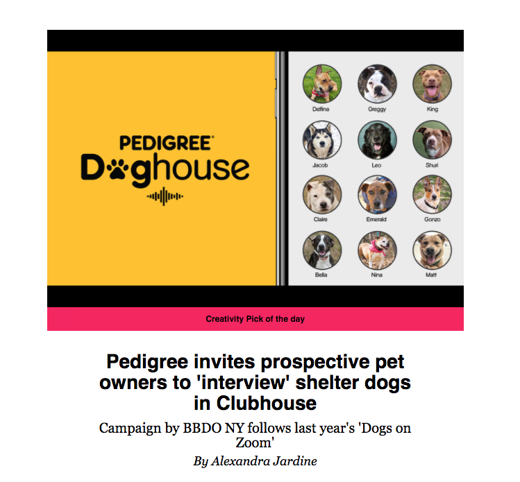 Still waiting to be let into Clubhouse? 20 shelter dogs beat you to it. Pedigree became the first brand to create a campaign on the newly popular audio app, Clubhouse, by "hacking" the platform and creating accounts for shelter dogs. During COVID, Clubhouse rose to the top of the charts on the App store, and we knew this was a moment in time to hop on quicly before the hype was dead. A fully proactive idea that was executed from start to finish in only three weeks.